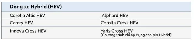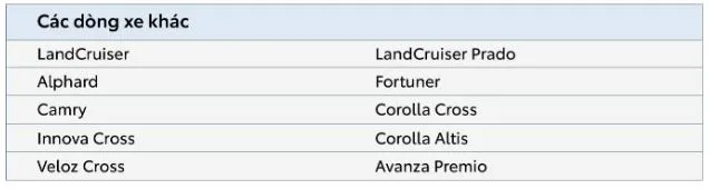 Chương trình được áp dụng cho một số dòng xe nhất định do Toyota Việt Nam phân phối thông qua các Đại lý ủy quyền chính hãng. Bao gồm các dòng xe sau: